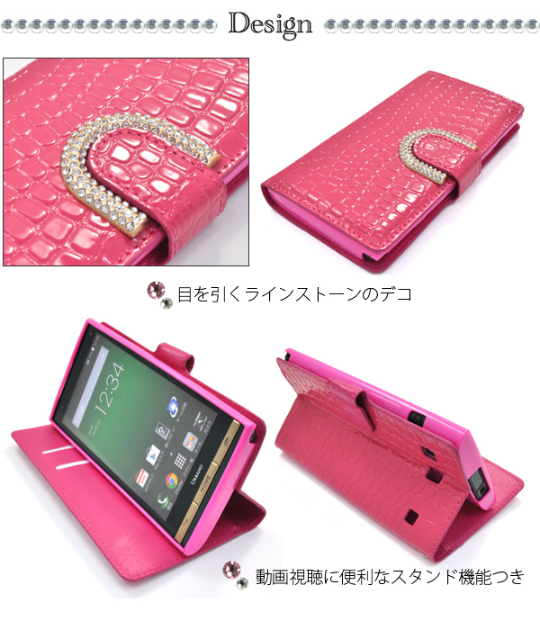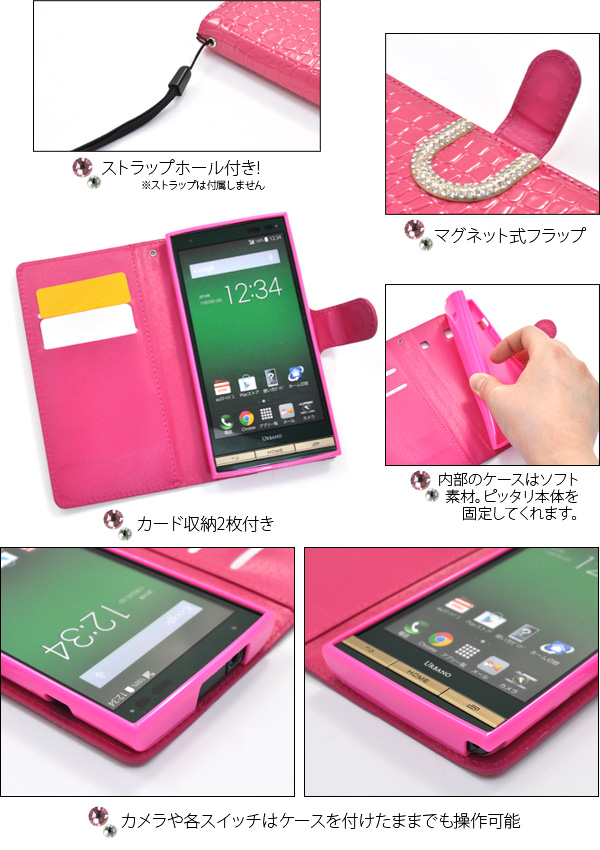 クロコダイルレザーデザインにデコをあしらった女性にピッタリのポーチケースです。 内側にはカード収納がついているので、定期やICカードなどを入れてお使いいただくと便利です♪ 開閉はマグネット式で、使い勝手の良い手帳型です。またストラップホールもついています。 衝撃やキズなどからURBANO V01 KYV31用を守るのはもちもん、 カメラ、イヤホンや各種ボタンなどをケースに入れたまま操作可能です。 カラーはビビッドピンク、ホワイト、ブラックの3色からお選びいただけます。 ※URBANO V01 KYV31用は付属しません。 ※ライセンス商品ではありません。 |