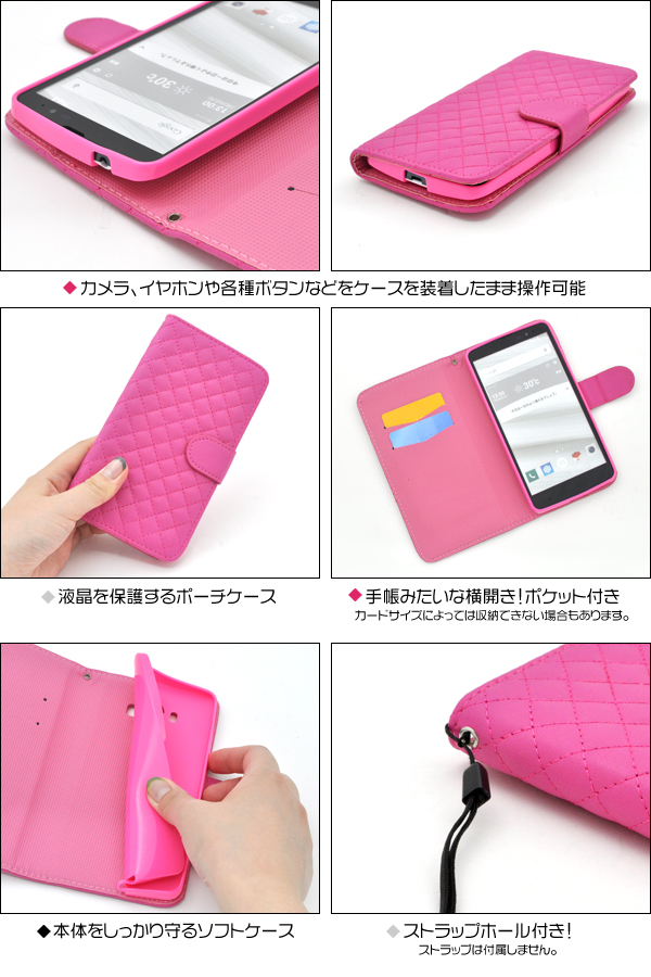 触り心地抜群のキルティングレザーを使用したオシャレなケースポーチです。 内部に備えられたソフトケースでしっかり固定し、 衝撃やキズ、埃などからisai vivid LGV32をしっかりと守ります。 背面を折り返すとスタンドとして使用できるので、動画視聴に便利です。 ポーチの内側にはポケットが付いているので、カード類を入れるのに便利! ケースを装着したまま、充電やヘッドフォンジャックの接続、カメラや各種ボタンの操作も可能です。 ビビットピンク、ホワイト、ブラックの3色からお選びください。 ※isai vivid LGV32は付属しません。ライセンス商品ではありません。 ※ケースをつけたまま撮影できますが、フラッシュ撮影時にケースの色が移り込むことがあります。 |