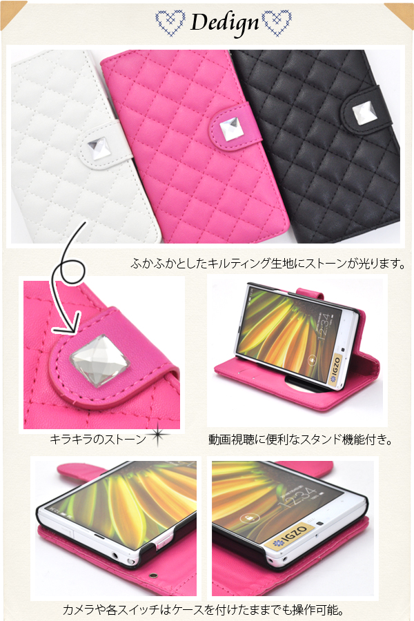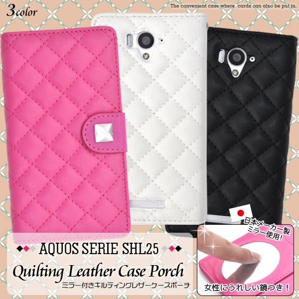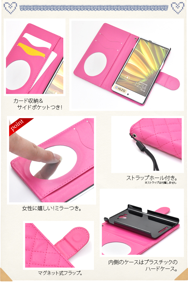 内側に鏡(日本メーカー製)が付いているのでちょっとした身だしなみのチェックもできます。 ケースを装着したまま、充電やヘッドフォンジャックの接続、カメラや各種ボタンの操作も可能です。 開閉はマグネット式で、使い勝手の良い手帳型です。またストラップホールもついています。 背面を折り返すとスタンドとして使用できるので、動画視聴に便利です。 ポーチの内側にはカード収納とカードポケットも付いています。 ブラック、ビビットピンク、ホワイトの3色からお選びください。 ※AQUOS SERIE SHL25は付属しません。ライセンス商品ではありません。 ※ケースをつけたまま撮影できますが、フラッシュ撮影時にケースの色が移り込むことがあります。 |