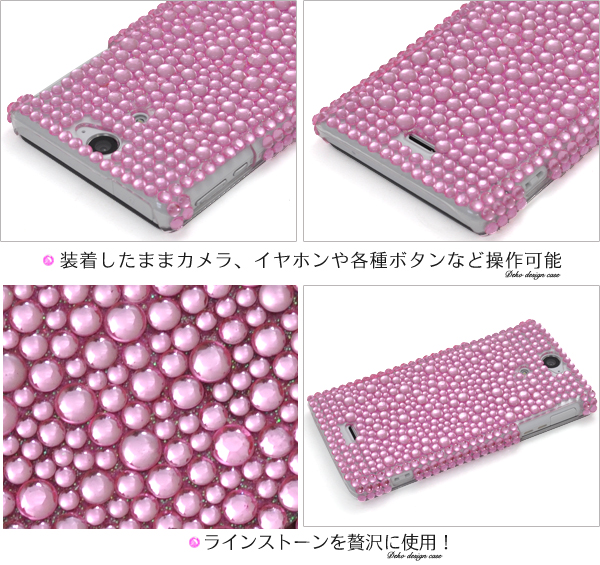 キラキララインストーンを贅沢に使用しました! もちろん、衝撃やキズ、埃などからXperia VL SOL21をしっかりと守ります。 カメラ、イヤホンや各種ボタンなどをケースに入れたまま操作可能です。 ピンク・ホワイト・ミックスピンクの3色展開です。 |