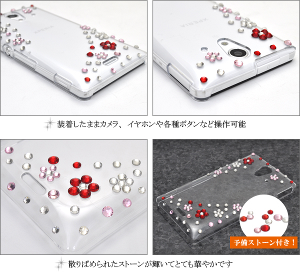 ストーンで配置されたお花が輝く、華やかなデコケースです。 もちろん、衝撃やキズ、埃などからXperia UL SOL22をしっかりと守ります。 カメラ、イヤホンや各種ボタンなどをケースに入れたまま操作可能です。 ラインストーンが取れてしまった時に便利な、予備ストーン付きです。 3種類のデザインからお選びいただけます。 |