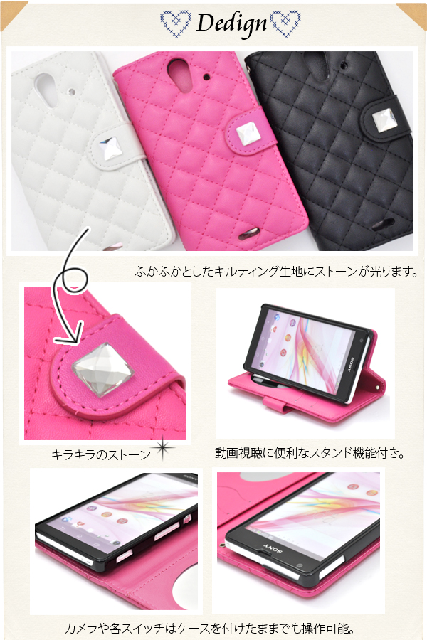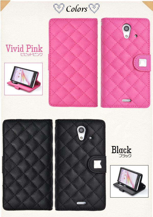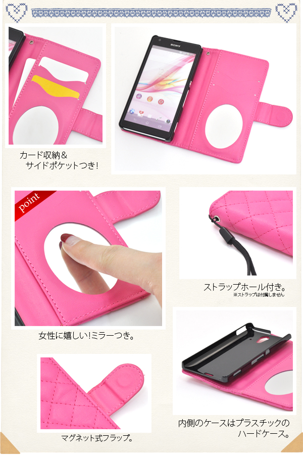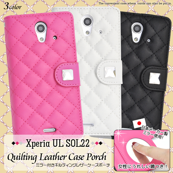 内側に鏡(日本メーカー製)が付いているのでちょっとした身だしなみのチェックもできます。 ケースを装着したまま、充電やヘッドフォンジャックの接続、カメラや各種ボタンの操作も可能です。 開閉はマグネット式で、使い勝手の良い手帳型です。またストラップホールもついています。 背面を折り返すとスタンドとして使用できるので、動画視聴に便利です。 ポーチの内側にはカード収納とカードポケットも付いています。 ブラック、ビビットピンク、ホワイトの3色からお選びください。 ※Xperia UL SOL22は付属しません。ライセンス商品ではありません。 ※ケースをつけたまま撮影できますが、フラッシュ撮影時にケースの色が移り込むことがあります。 |
