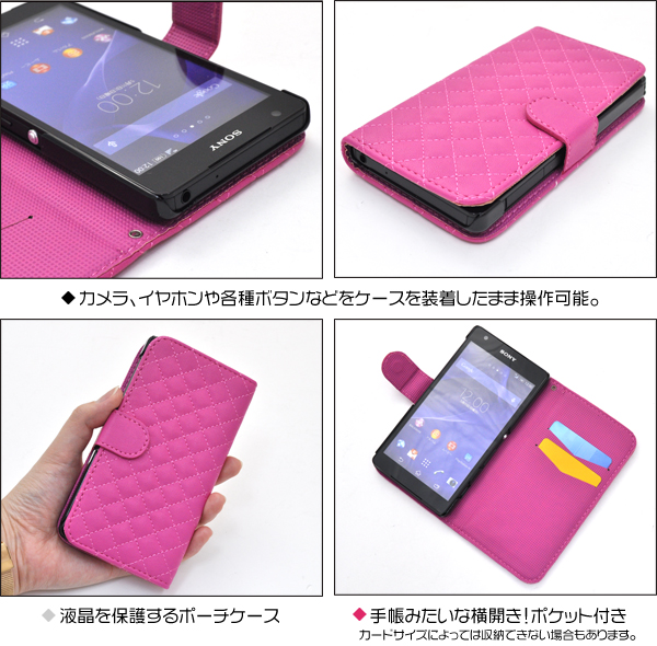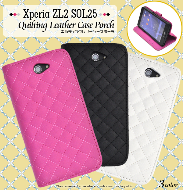 触り心地抜群のキルティングレザーを使用したオシャレなケースポーチです。 内部に備えられたプラスチックケースでしっかり固定し、 衝撃やキズ、埃などからXperia ZL2 SOL25をしっかりと守ります。 背面を折り返すとスタンドとして使用できるので、動画視聴に便利です。 ポーチの内側にはポケットが付いているので、カード類を入れるのに便利! ケースを装着したまま、充電やヘッドフォンジャックの接続、カメラや各種ボタンの操作も可能です。 ブラック、ビビットピンク、ホワイトの3色からお選びください。 ※Xperia ZL2 SOL25は付属しません。ライセンス商品ではありません。 ※ケースをつけたまま撮影できますが、フラッシュ撮影時にケースの色が移り込むことがあります。 |
