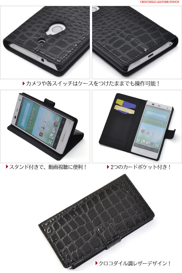 クロコダイルレザーデザインのARROWS NX F-01F用スタンドケースポーチ。