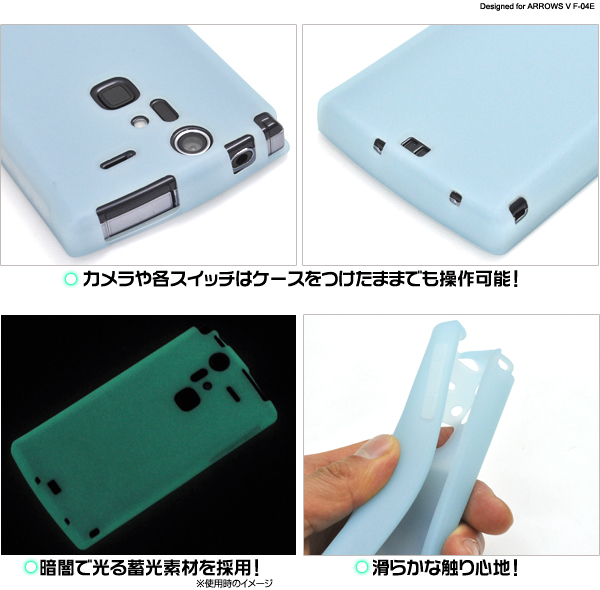 | カバンの中や暗闇で光る、蓄光仕様のARROWS V F-04E用シリコンケース 蛍光灯の光や太陽光を蓄え、暗闇で光る蓄光素材を採用! カバンの中や暗闇でも簡単にスマホ見つけることができます。 素材にシリコンを採用することで、ぴったりなフィット感と滑らかな触り心地を実現! また、カメラはもちろん、イヤホンや各種ボタンなどをケースに入れたまま操作可能です! ブルー、ピンク、グリーンの3色展開です。 ※ライセンス商品ではありません。 ※ARROWS V F-04Eは付属しません。 |