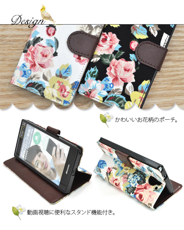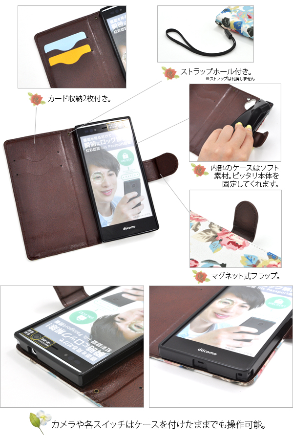 外側は花柄、内側は落ち着いたレザーデザインです。 内側にはカード収納がついているので定期やICカードなどを入れてお使いいただくと便利です♪ 開閉はマグネット式で、使い勝手の良い手帳型です。またストラップホールもついています。 衝撃やキズなどからARROWS NX F-04Gを守るのはもちろん、 カメラ、イヤホンや各種ボタンなどをケースに入れたまま操作可能です。 カラーはホワイトとブラックの2色からお選びいただけます。 ※ARROWS NX F-04Gは付属しません。 ※ライセンス商品ではありません。 |