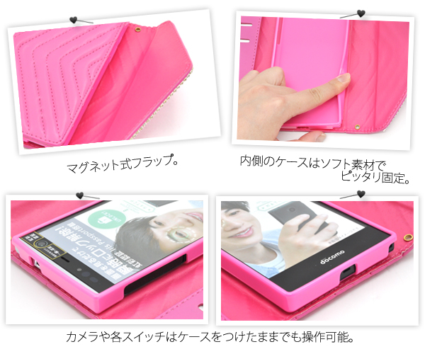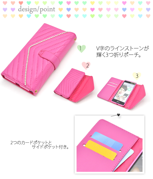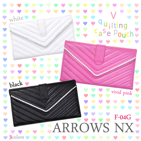 キルティングが大人かわいいV字キルティングケースポーチ。 3つ折りになっており、内側にはカード収納ポケットが2つとサイドポケットが付いています。 衝撃やキズなどからARROWS NX F-04G用を守るのはもちろん、 カメラ、イヤホンや各種ボタンなどをケースに入れたまま操作可能です。 カラーはビビッドピンク、ホワイト、ブラックの3色からお選びいただけます。 ※ARROWS NX F-04Gは付属しません。 ※ライセンス商品ではありません。 |