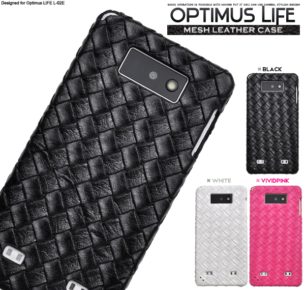 スタイリッシュなメッシュレザーデザインのOptimus LIFE L-02E用ケース 衝撃やキズ、埃などからしっかりとOptimus LIFE L-02Eを守ります。 便利なストラップホール付きです。 カメラはもちろん、イヤホンや各種ボタンなどをケースに入れたまま操作可能です! ブラック、ホワイト、ビビットピンクの3色展開です。 ※ライセンス商品ではありません。 ※Optimus LIFE L-02Eは付属しません。 |