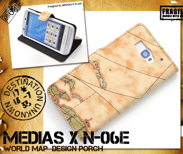 レトロな世界地図デザインがオシャレな、MEDIAS X N-06E用ケースポーチ!