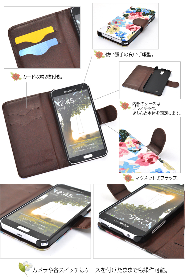 外側は花柄、内側は落ち着いたレザーデザインです。 内側にはカード収納がついているので定期やICカードなどを入れてお使いいただくと便利です♪ 開閉はマグネット式で、使い勝手の良い手帳型です。 衝撃やキズなどからGALAXY J SC-02F用を守るのはもちもん、 カメラ、イヤホンや各種ボタンなどをケースに入れたまま操作可能です。 カラーはホワイトとブラックの2色からお選びいただけます。 ※GALAXY J SC-02F用は付属しません。 ※ライセンス商品ではありません。 |