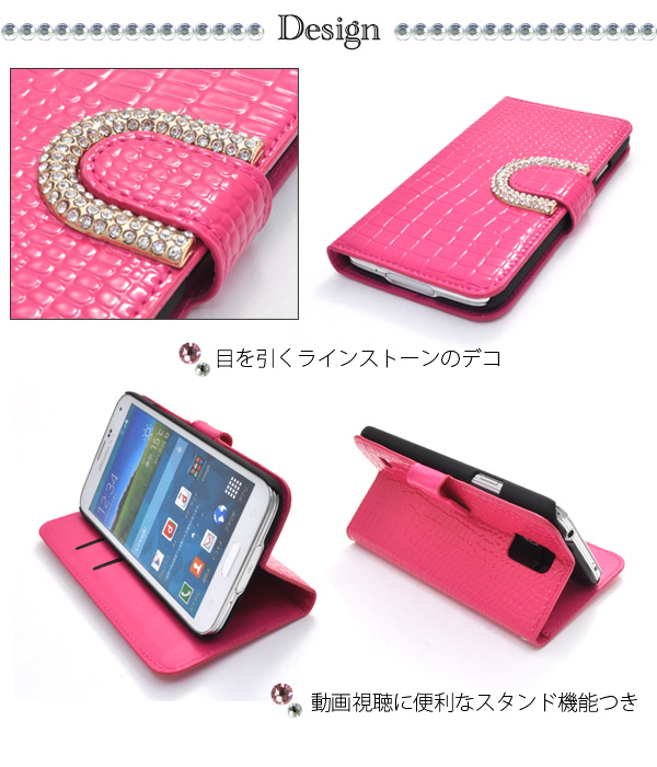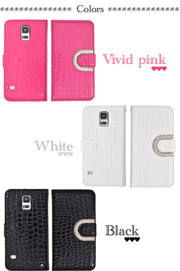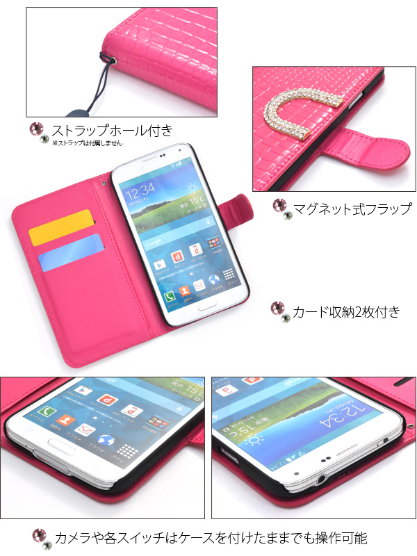 クロコダイルレザーデザインにデコをあしらった女性にピッタリのポーチケースです。 内側にはカード収納がついているので、定期やICカードなどを入れてお使いいただくと便利です♪ 開閉はマグネット式で、使い勝手の良い手帳型です。またストラップホールもついています。 衝撃やキズなどからGALAXY S5 SC-04F/SCL23用を守るのはもちもん、 カメラ、イヤホンや各種ボタンなどをケースに入れたまま操作可能です。 カラーはビビッドピンク、ホワイト、ブラックの3色からお選びいただけます。 ※GALAXY S5 SC-04F/SCL23用は付属しません。 ※ライセンス商品ではありません。 |