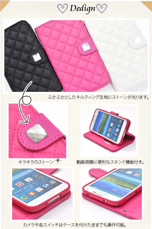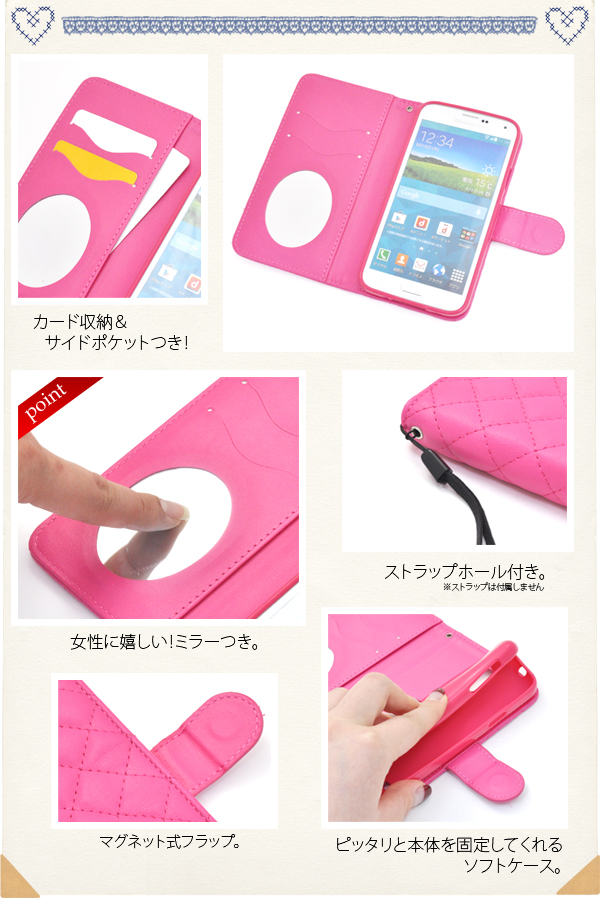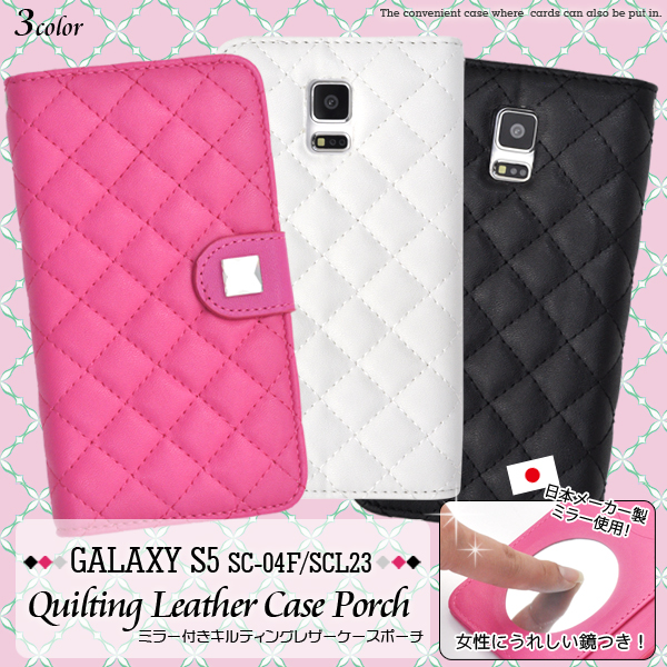 内側に鏡(日本メーカー製)が付いているのでちょっとした身だしなみのチェックもできます。 ケースを装着したまま、充電やヘッドフォンジャックの接続、カメラや各種ボタンの操作も可能です。 開閉はマグネット式で、使い勝手の良い手帳型です。またストラップホールもついています。 背面を折り返すとスタンドとして使用できるので、動画視聴に便利です。 ポーチの内側にはカード収納とカードポケットも付いています。 ブラック、ビビットピンク、ホワイトの3色からお選びください。 ※GALAXY S5 SC-04F/SCL23は付属しません。ライセンス商品ではありません。 ※ケースをつけたまま撮影できますが、フラッシュ撮影時にケースの色が移り込むことがあります。 |