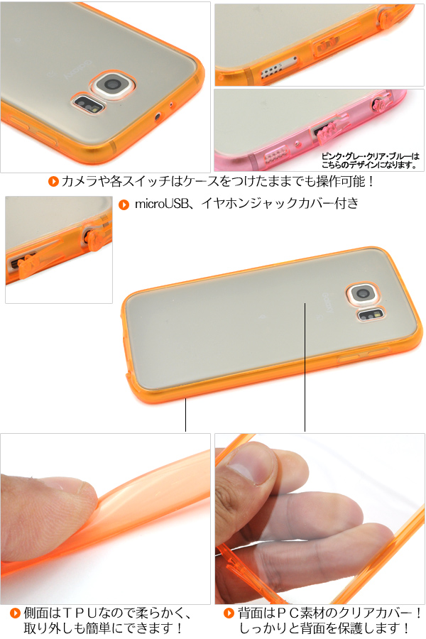 衝撃やキズ、埃などからしっかりとGalaxy S6 SC-05Gを守ります。 側面はTPU素材なので柔らかく、取り外しも簡単! また、背面はPC素材なので、しっかりと背面を保護します。 もちろん、装着したまま充電や各種ボタンの操作も行えるようにデザインされています。 埃の侵入を防ぐ、microUSBとイヤホンジャックカバー付きです。 ※ライセンス商品ではありません。 ※Galaxy S6 SC-05Gは付属しません。 |