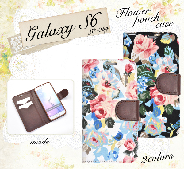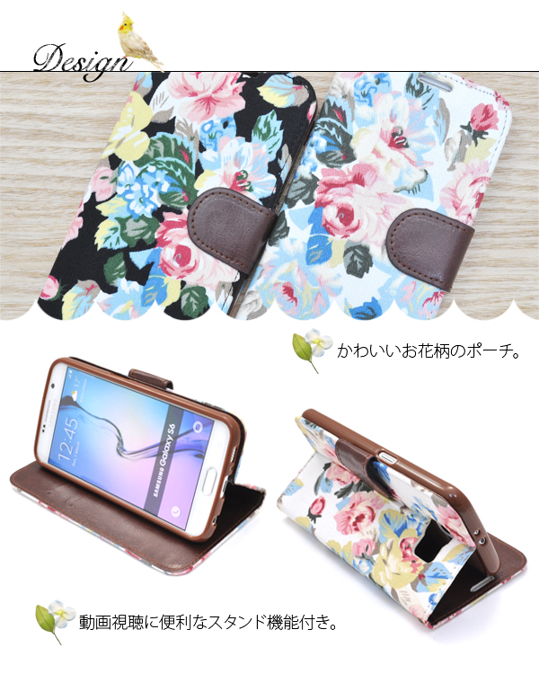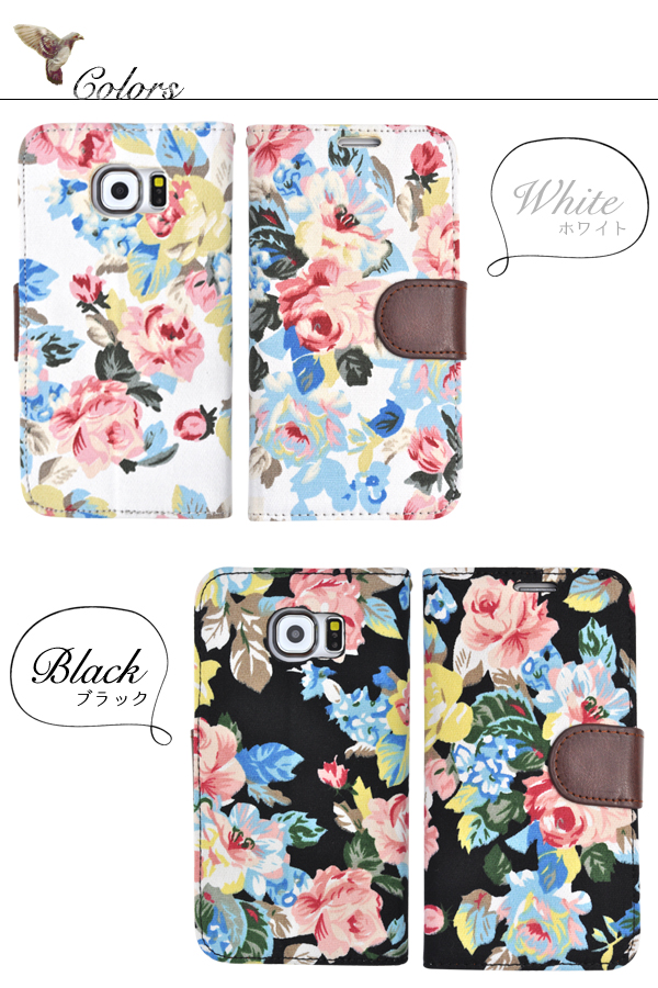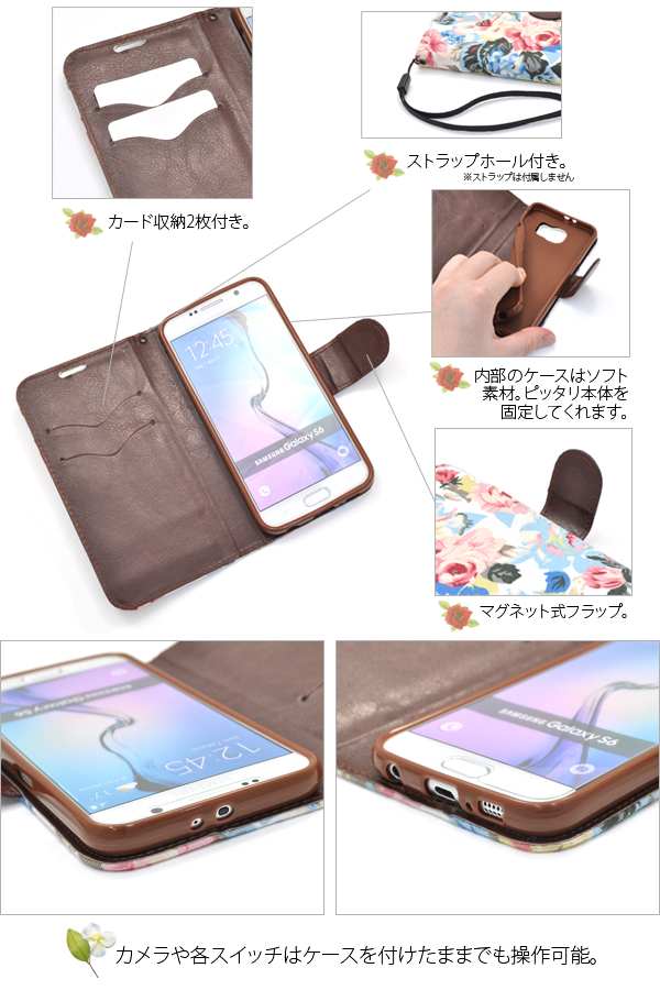 外側は花柄、内側は落ち着いたレザーデザインです。 内側にはカード収納がついているので定期やICカードなどを入れてお使いいただくと便利です♪ 開閉はマグネット式で、使い勝手の良い手帳型です。またストラップホールもついています。 衝撃やキズなどからGalaxy S6 SC-05G用を守るのはもちもん、 カメラ、イヤホンや各種ボタンなどをケースに入れたまま操作可能です。 カラーはホワイトとブラックの2色からお選びいただけます。 ※Galaxy S6 SC-05G用は付属しません。 ※ライセンス商品ではありません。 |