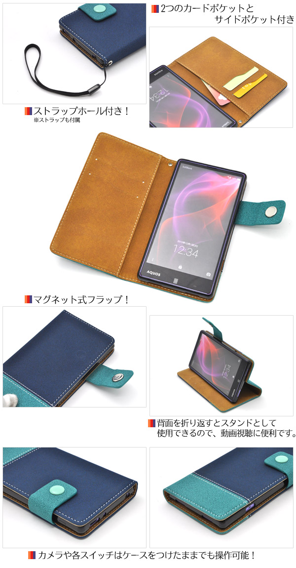 カラフルなツートーン配色のケースポーチです。 内部に備えられたソフトケースでしっかり固定し、 衝撃やキズ、埃などからAQUOS ZETA SH-01H/AQUOS Xx2 502SHをしっかりと守ります。 背面を折り返すとスタンドとして使用できるので、動画視聴に便利です。 ポーチの内側にはポケットが付いているので、カード類を入れるのに便利! ケースを装着したまま、充電やヘッドフォンジャックの接続、カメラや各種ボタンの操作も可能です。 落下防止になるストラップも付属しています。 ブルー、レッド、オレンジの3色からお選びください。 ※AQUOS ZETA SH-01H/AQUOS Xx2 502SHは付属しません。ライセンス商品ではありません。 |