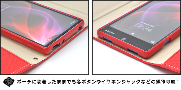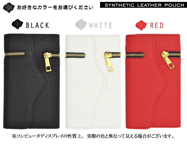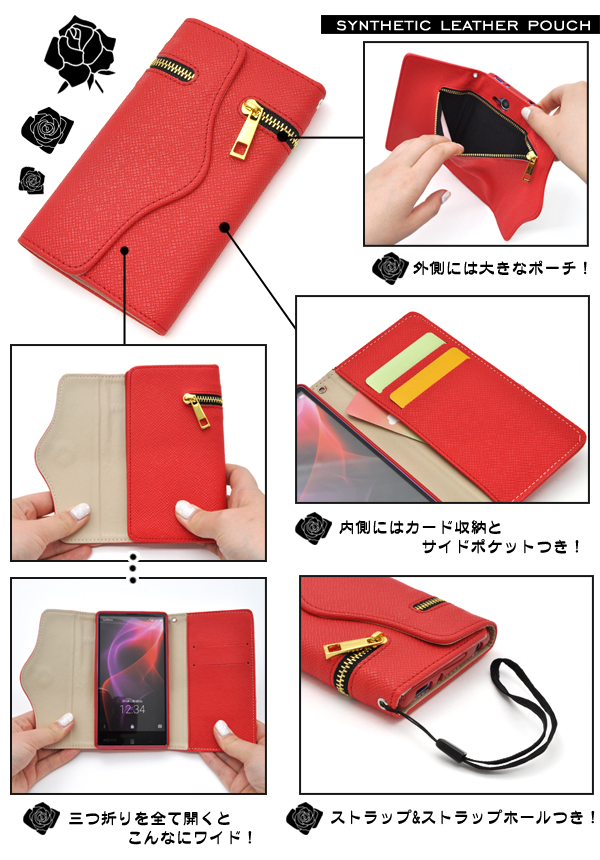 3つ折りレザーポーチです。 外側のチャックを開けるとポーチ替わりになって便利! アクセサリーなどを入れておけば無くす心配もありません。 内側にはカード収納ポケットが2つとサイドポケットが付いています。 また、ストラップホールとストラップ付きです。 もちろん、ポーチを装着したまま充電やヘッドフォンジャックなどの接続、各種ボタンの操作も可能です。 カラーはブラック、ホワイト、レッドの3色からお選びいただけます。 ※AQUOS ZETA SH-01H/AQUOS Xx2 502SHは付属しません。 ※ライセンス商品ではありません。 ※近接センサー・ 指紋センサー穴は開いていません。 |