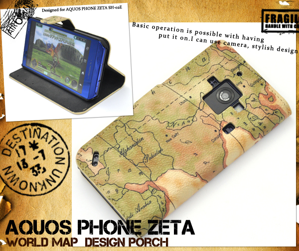 レトロな世界地図デザインがオシャレな、AQUOS PHONE ZETA SH-02E用ケースポーチ!