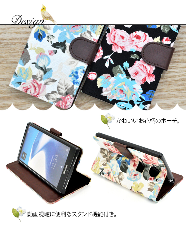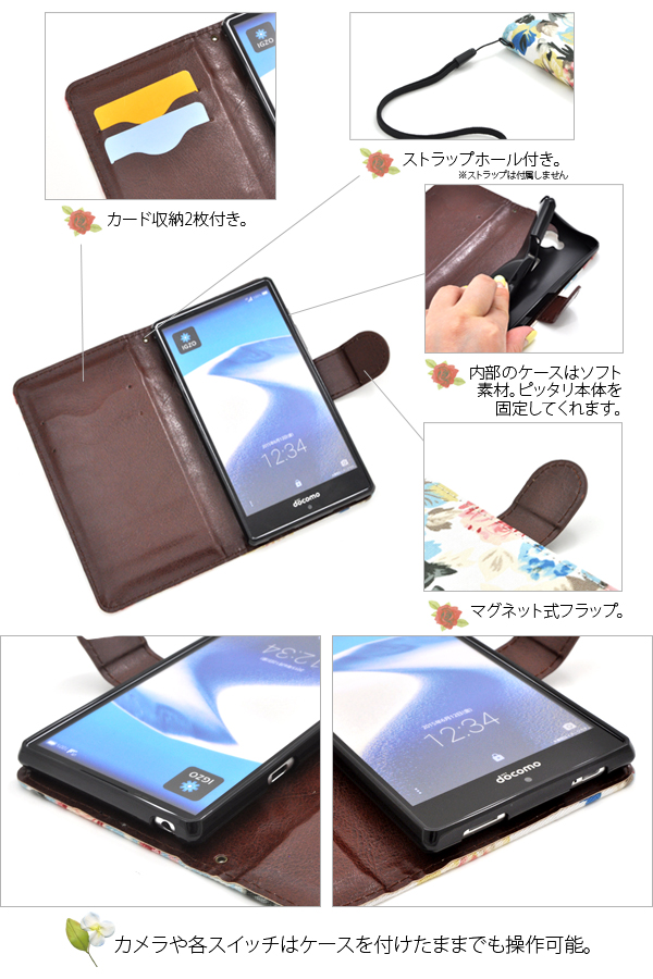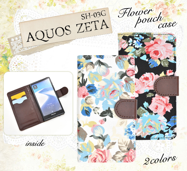 外側は花柄、内側は落ち着いたレザーデザインです。 内側にはカード収納がついているので定期やICカードなどを入れてお使いいただくと便利です♪ 開閉はマグネット式で、使い勝手の良い手帳型です。またストラップホールもついています。 衝撃やキズなどからAQUOS ZETA SH-03Gを守るのはもちろん、 カメラ、イヤホンや各種ボタンなどをケースに入れたまま操作可能です。 カラーはホワイトとブラックの2色からお選びいただけます。 ※AQUOS ZETA SH-03Gは付属しません。 ※ライセンス商品ではありません。 |