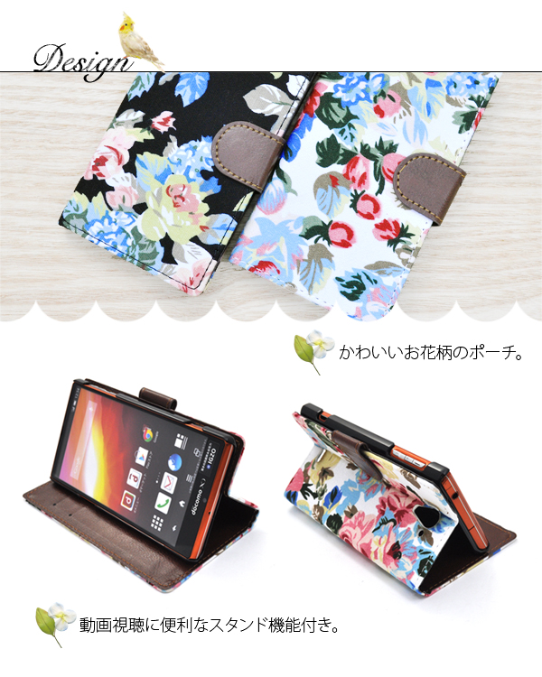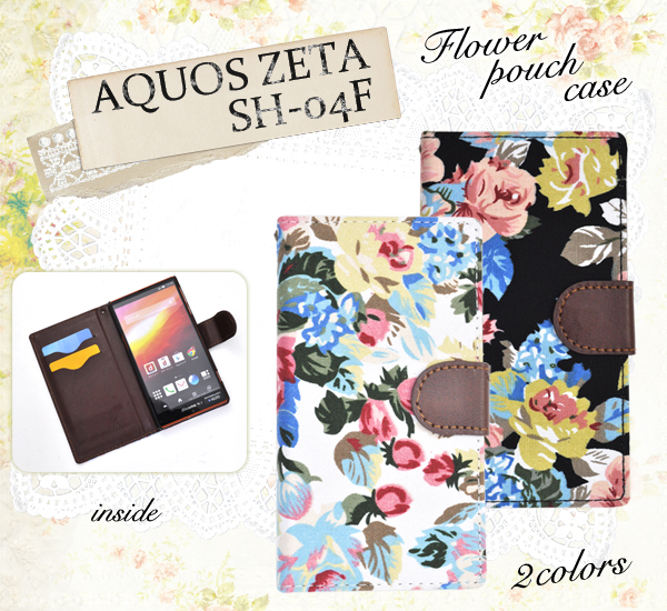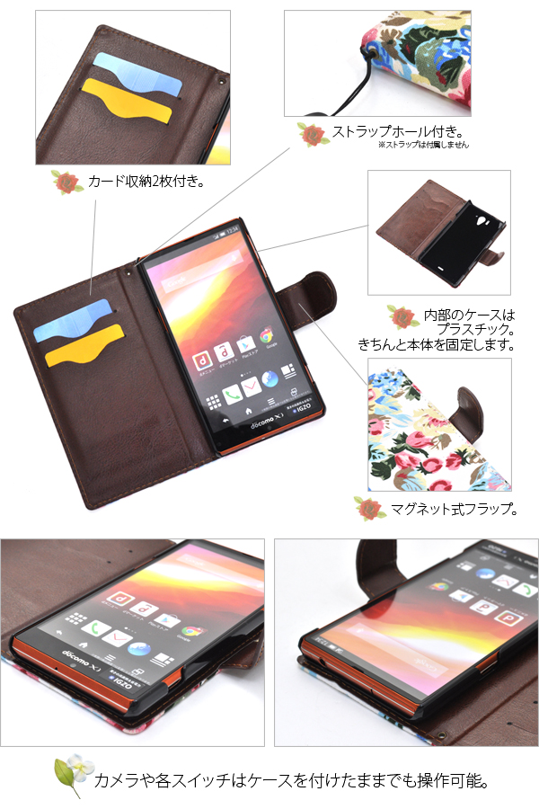 外側は花柄、内側は落ち着いたレザーデザインです。 内側にはカード収納がついているので定期やICカードなどを入れてお使いいただくと便利です♪ 開閉はマグネット式で、使い勝手の良い手帳型です。またストラップホールもついています。 衝撃やキズなどからAQUOS ZETA SH-04F用を守るのはもちもん、 カメラ、イヤホンや各種ボタンなどをケースに入れたまま操作可能です。 カラーはホワイトとブラックの2色からお選びいただけます。 ※AQUOS ZETA SH-04F用は付属しません。 ※ライセンス商品ではありません。 |