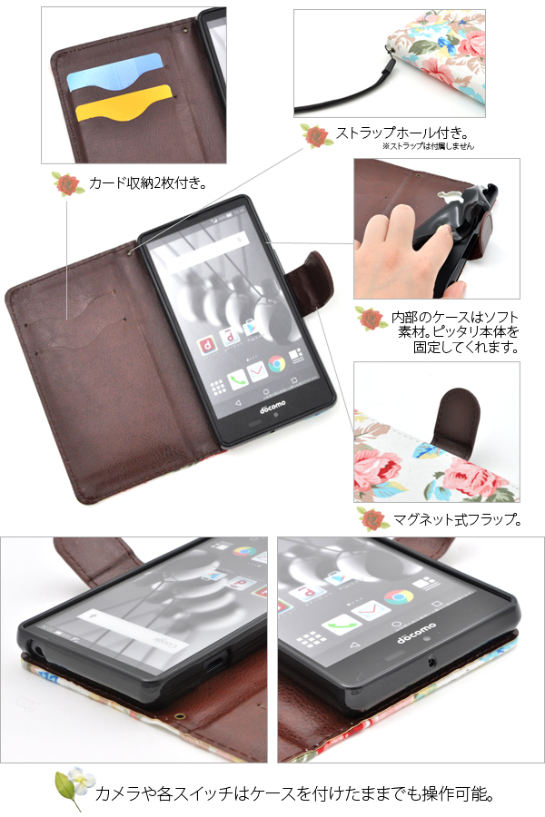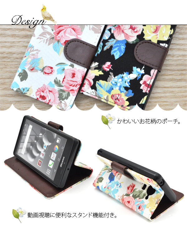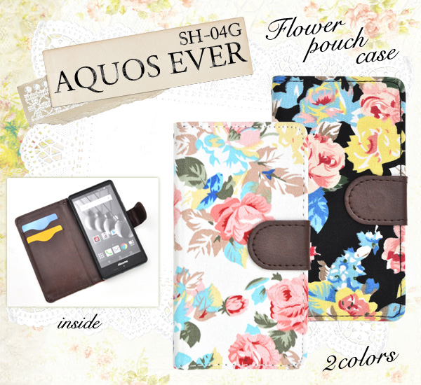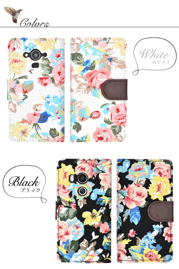 外側は花柄、内側は落ち着いたレザーデザインです。 内側にはカード収納がついているので定期やICカードなどを入れてお使いいただくと便利です♪ 開閉はマグネット式で、使い勝手の良い手帳型です。またストラップホールもついています。 衝撃やキズなどからAQUOS EVER SH-04Gを守るのはもちろん、 カメラ、イヤホンや各種ボタンなどをケースに入れたまま操作可能です。 カラーはホワイトとブラックの2色からお選びいただけます。 ※AQUOS EVER SH-04Gは付属しません。 ※ライセンス商品ではありません。 ※デザイン、色味は画像と異なる場合がございます。 |