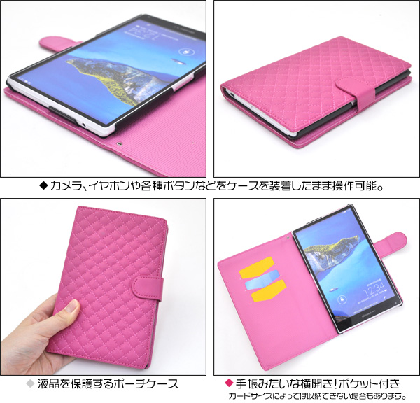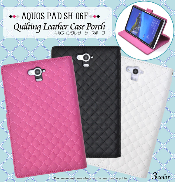 触り心地抜群のキルティングレザーを使用したオシャレなケースポーチです。 内部に備えられたプラスチックケースでしっかり固定し、 衝撃やキズ、埃などからAQUOS PAD SH-06Fをしっかりと守ります。 背面を折り返すとスタンドとして使用できるので、動画視聴に便利です。 ポーチの内側にはポケットが付いているので、カード類を入れるのに便利! ケースを装着したまま、充電やヘッドフォンジャックの接続、カメラや各種ボタンの操作も可能です。 ブラック、ビビットピンク、ホワイトの3色からお選びください。 ※AQUOS PAD SH-06Fは付属しません。ライセンス商品ではありません。 ※ケースをつけたまま撮影できますが、フラッシュ撮影時にケースの色が移り込むことがあります。 |