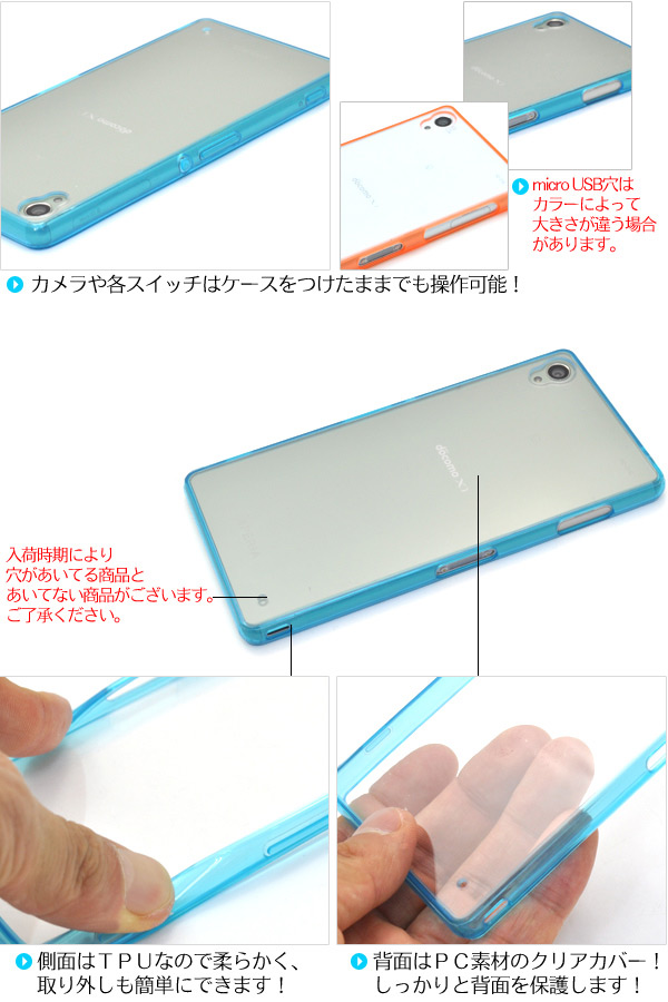 衝撃やキズ、埃などからしっかりとXperia Z3を守ります。 側面はTPU素材なので柔らかく、取り外しも簡単! また、背面はPC素材なので、しっかりと背面を保護します。 もちろん、装着したまま充電や各種ボタンの操作も行えるようにデザインされています。 ※ライセンス商品ではありません。 ※Xperia Z3は付属しません。 |