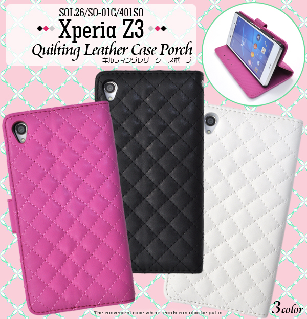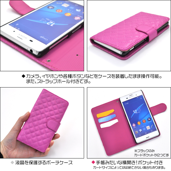 触り心地抜群のキルティングレザーを使用したオシャレなケースポーチです。 内部に備えられたプラスチックケースでしっかり固定し、 衝撃やキズ、埃などからXperia Z3をしっかりと守ります。 背面を折り返すとスタンドとして使用できるので、動画視聴に便利です。 ポーチの内側にはポケットが付いているので、カード類を入れるのに便利! ケースを装着したまま、充電やヘッドフォンジャックの接続、カメラや各種ボタンの操作も可能です。 また、ストラップホールつきです。 ブラック、ビビットピンク、ホワイトの3色からお選びください。 ※Xperia Z3(SOL26/SO-01G/401SO)は付属しません。ライセンス商品ではありません。 ※ケースをつけたまま撮影できますが、フラッシュ撮影時にケースの色が移り込むことがあります。 |