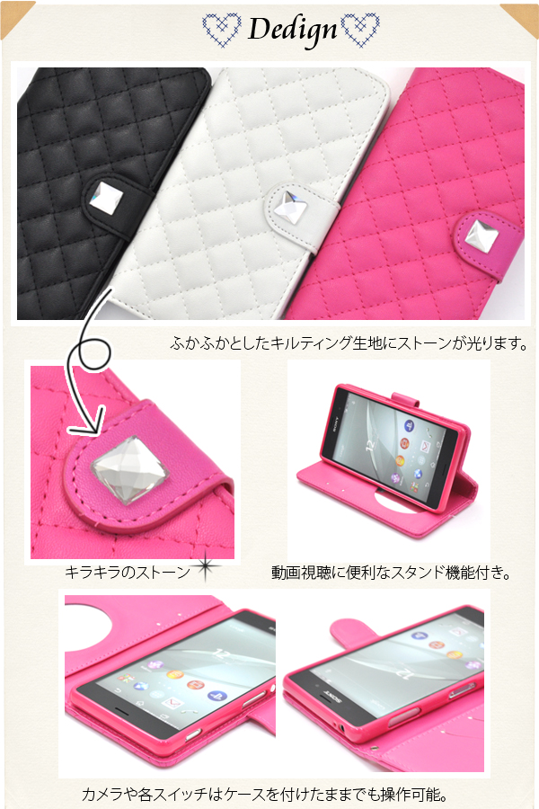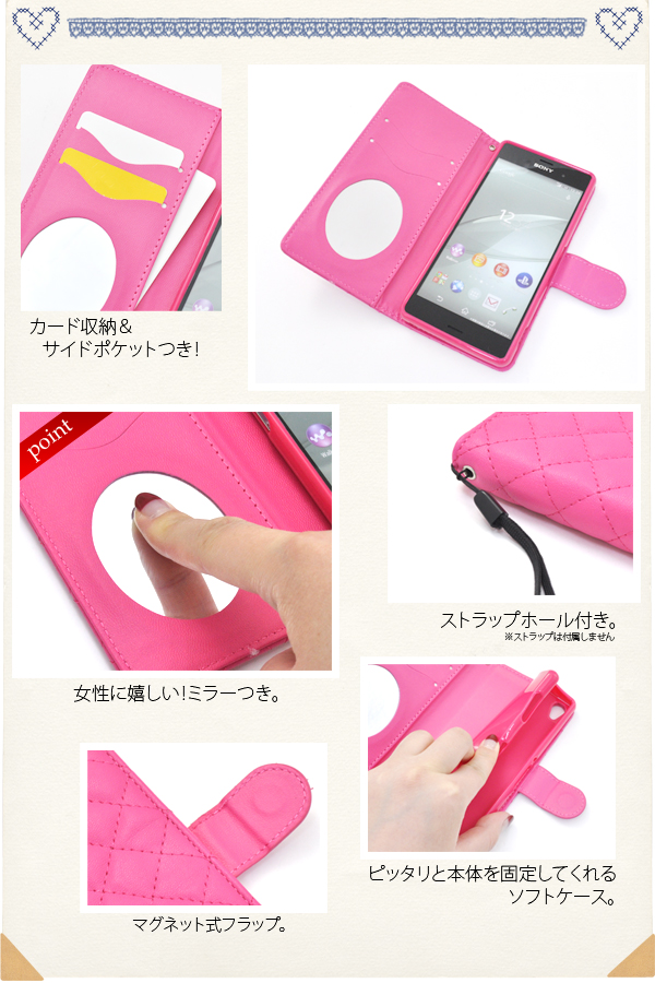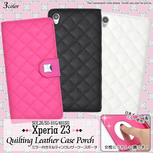 内側に日本メーカー製の鏡が付いているのでちょっとした身だしなみのチェックもできます。 ケースを装着したまま、充電やヘッドフォンジャックの接続、カメラや各種ボタンの操作も可能です。 開閉はマグネット式で、使い勝手の良い手帳型です。またストラップホールもついています。 背面を折り返すとスタンドとして使用できるので、動画視聴に便利です。 ポーチの内側にはカード収納とカードポケットも付いています。 ブラック、ビビットピンク、ホワイトの3色からお選びください。 ※Xperia Z3(SOL26/SO-01G/401SO)は付属しません。ライセンス商品ではありません。 ※ケースをつけたまま撮影できますが、フラッシュ撮影時にケースの色が移り込むことがあります。 |