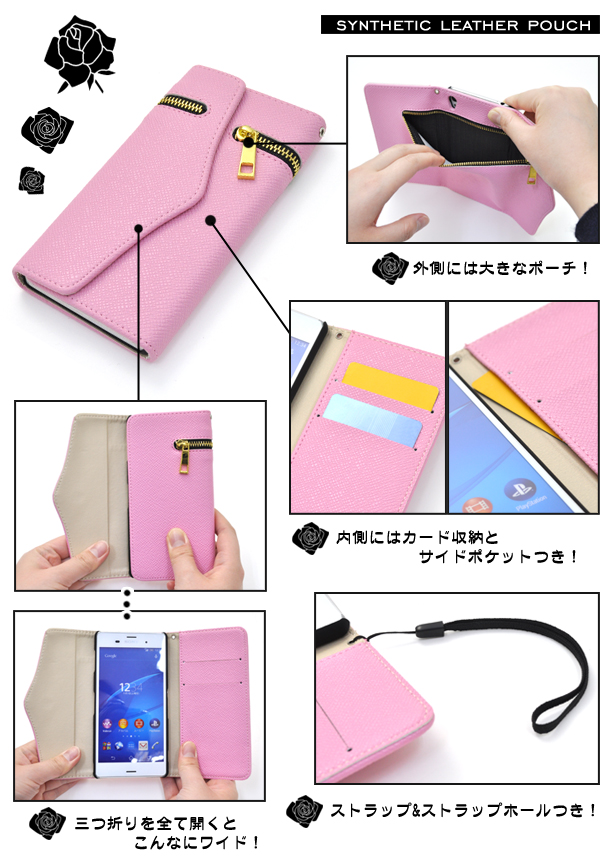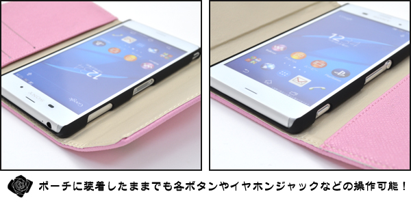 外側のチャックを開けるとポーチ替わりになって便利! アクセサリーなどを入れておけば無くす心配もありません。 内側にはカード収納ポケットが2つとサイドポケットが付いています。 また、ストラップホールとストラップ付きです。 もちろん、ポーチを装着したまま充電やヘッドフォンジャックなどの接続、各種ボタンの操作も可能です。 カラーはブラック、ホワイト、ピンクの3色からお選びいただけます。 ※Xperia Z3(SOL26/SO-01G/401SO)は付属しません。 ※ライセンス商品ではありません。 |