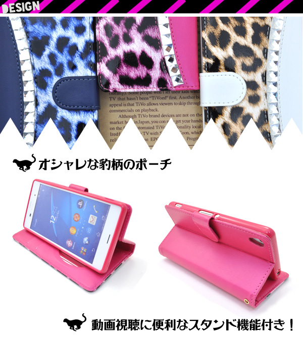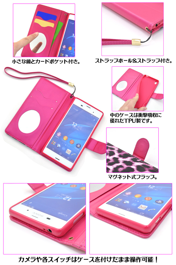 レザーを使用しているので手触りも抜群! 内側にはカード収納がついているので定期やICカードなどを入れてお使いいただけます。 小さな鏡も付いているので、お化粧直しなどもできて便利です! 衝撃やキズなどからXperia Z3を守るのはもちもん、 カメラ、イヤホンや各種ボタンなどをケースに入れたまま操作することもできます。 色はビビッドピンク、ホワイト、ブルーの2色からお選びいただけます。 ※Xperia Z3は付属しません。 ※ライセンス商品ではありません。 |