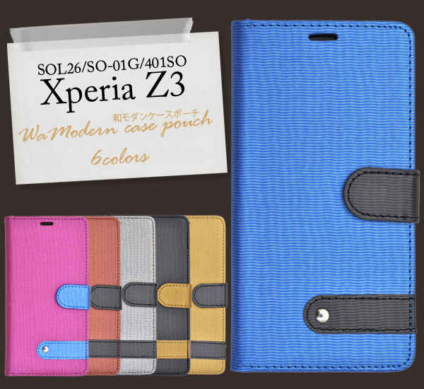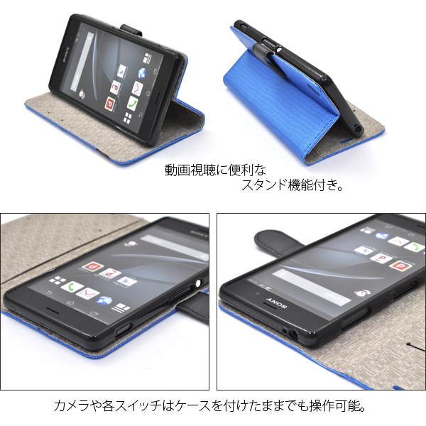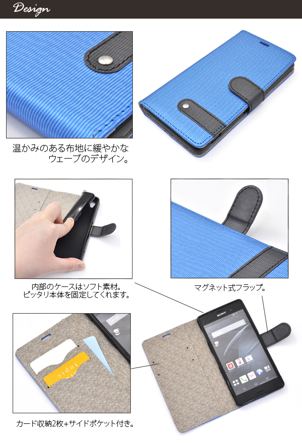 布地の温かみのある落ち着いたデザインです。 開閉はマグネット式で、使い勝手の良い手帳型。内側にはカード収納とサイドポケットつきです。 衝撃やキズなどからXperia Z3を守るのはもちもん、 カメラ、イヤホンや各種ボタンなどをケースに入れたまま操作可能です。 カラーはブルー、レッド、ブラック、グレー、イエロー、ピンクの6色からお選びいただけます。 ※Xperia Z3(SOL26/SO-01G/401SO)は付属しません。 ※ライセンス商品ではありません。 |