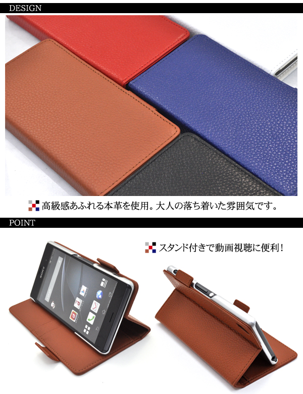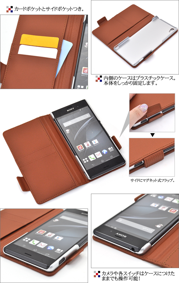 ビジネスシーンなどにも最適な落ち着いたデザインです。 内部にはプラスチックケースを備え、本体をしっかりと固定します。 横開きタイプなので、手帳のように使うことができます。 また、内側に2つのカードポケットとサイドポケットが付いています。 ※Xperia Z3は付属しません。 ※ライセンス商品ではありません※カードは付属しません。 |
