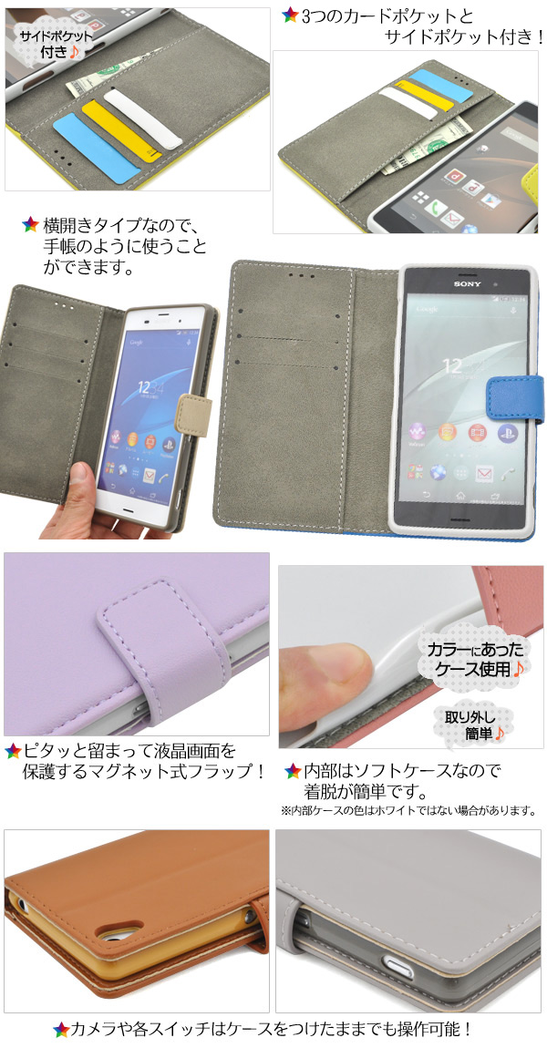 | 注意 | ※本製品はマグネットを使用しておりますのでクレジットカードなどの磁気カードの収納は避け、カードの注意事項をよくご確認の上ご使用ください。 読み取り等ができなくなる恐れがあります。 ※本製品に収納された、カードのデータ等が喪失された場合におきましても、 当社では一切保証致しかねます。 ※Xperia Z3は付属しません。 ※ライセンス商品ではありません ※カードは付属しません。 ※画像の色調はご使用のモニターの機種や設定により実際の商品と異なる場合があります。 |