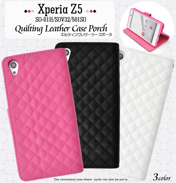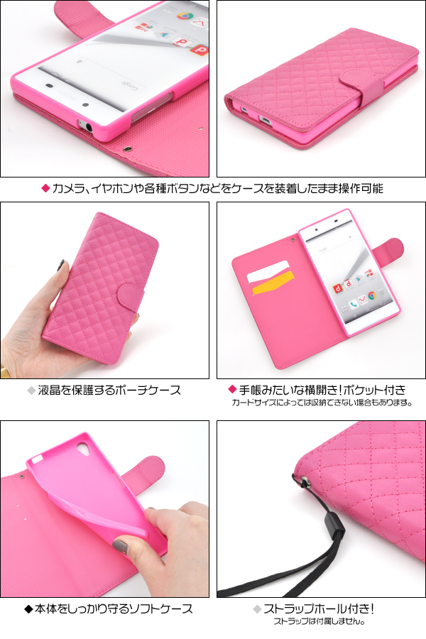 触り心地抜群のキルティングレザーを使用したオシャレなケースポーチです。 内部に備えられたソフトケースでしっかり固定し、 衝撃やキズ、埃などからXperia Z5 (SO-01H/SOV32/501SO)をしっかりと守ります。 背面を折り返すとスタンドとして使用できるので、動画視聴に便利です。 ポーチの内側にはポケットが付いているので、カード類を入れるのに便利! ケースを装着したまま、充電やヘッドフォンジャックの接続、カメラや各種ボタンの操作も可能です。 ブラック、ビビットピンク、ホワイトの3色からお選びください。 ※Xperia Z5 (SO-01H/SOV32/501SO)は付属しません。ライセンス商品ではありません。 ※ケースをつけたまま撮影できますが、フラッシュ撮影時にケースの色が移り込むことがあります。 |