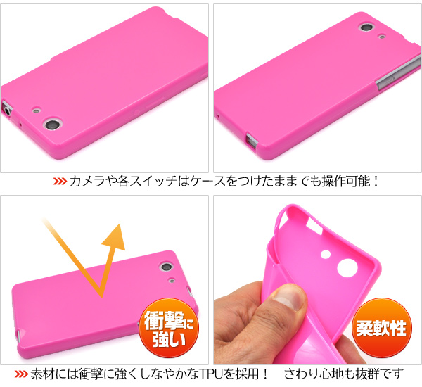 ポップなカラーに美しい光沢感を備えた、ソフトケースです。 素材は適度な硬さと弾力性をあわせ持つTPUを採用。 衝撃に強く耐久性に優れ、手触りも抜群です。 もちろん、装着したまま充電や各種ボタンの操作も行えるようにデザインされています。 ※Xperia Z3 Compact SO-02Gは付属しません。※ライセンス商品ではありません。 ※卓上ホルダ充電には対応していません。 |