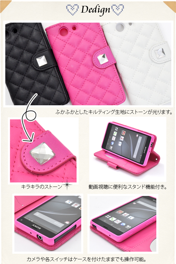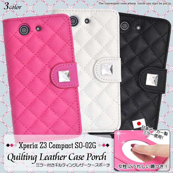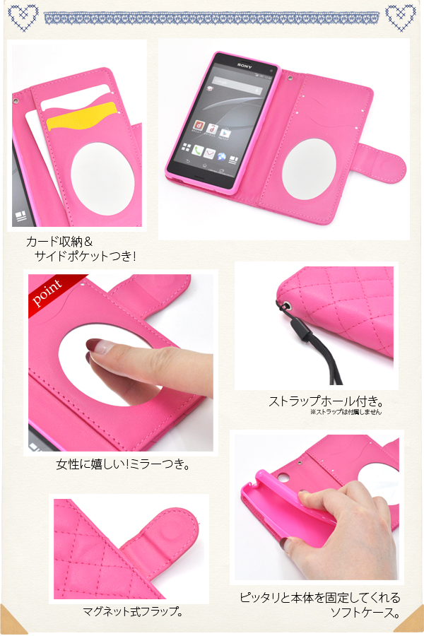 内側に鏡(日本メーカー製)が付いているのでちょっとした身だしなみのチェックもできます。 ケースを装着したまま、充電やヘッドフォンジャックの接続、カメラや各種ボタンの操作も可能です。 開閉はマグネット式で、使い勝手の良い手帳型です。またストラップホールもついています。 背面を折り返すとスタンドとして使用できるので、動画視聴に便利です。 ポーチの内側にはカード収納とカードポケットも付いています。 ブラック、ビビットピンク、ホワイトの3色からお選びください。 ※Xperia Z3 Compact SO-02Gは付属しません。ライセンス商品ではありません。 ※ケースをつけたまま撮影できますが、フラッシュ撮影時にケースの色が移り込むことがあります。 |