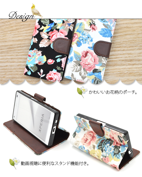 外側は花柄、内側は落ち着いたレザーデザインです。 内側にはカード収納がついているので定期やICカードなどを入れてお使いいただくと便利です♪ 開閉はマグネット式で、使い勝手の良い手帳型です。またストラップホールもついています。 衝撃やキズなどからXperia Z5 Compact SO-02Hを守るのはもちろん、 カメラ、イヤホンや各種ボタンなどをケースに入れたまま操作可能です。 カラーはホワイトとブラックの2色からお選びいただけます。 ※Xperia Z5 Compact SO-02Hは付属しません。 ※ライセンス商品ではありません。 ※デザイン、色味は画像と異なる場合がございます。 |