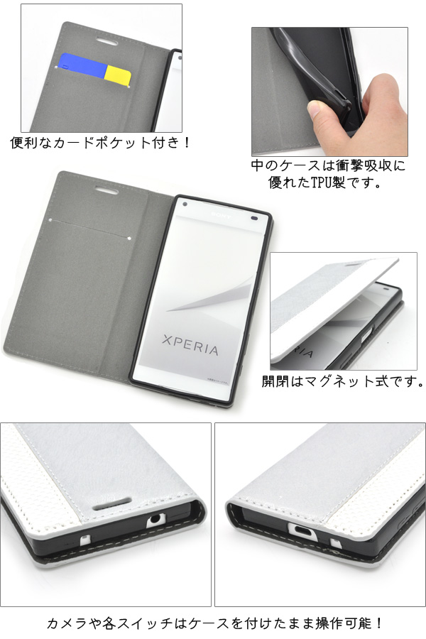 内側はスウェード調になっており手触りも抜群! 便利なカードポケットつきです! 衝撃やキズなどからXperia Z5を守るのはもちろん、 カメラ、イヤホンや各種ボタンなどをケースに入れたまま操作することもできます。 色はレッド、ブルー、シルバー、ピンク、ホワイト、パープル、ブラウン、ブラック、グレーの9色展開です。 ※Xperia Z5 Compact(SO-02H)は付属しません。 ※ライセンス商品ではありません。 |