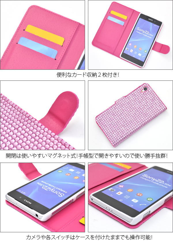 開閉はマグネット式で、便利な手帳型です。 内側にはカード収納もついていますので定期なども入れることができます。 もちろん衝撃やキズ、埃などからしっかりとXperia Z2 SO-03Fを守ります。 装着したまま充電や各種ボタンの操作も行えるようにデザインされています。 色はピンク、ブラック、シルバー、ゴールドの4色からお選びください。 (※1) ラインストーンはシリコン製の柔らかい物です。 ※ライセンス商品ではありません。 ※Xperia Z2 SO-03Fは付属しません。 ※衝撃を与えると、ラインストーンが取れる場合があります。 |