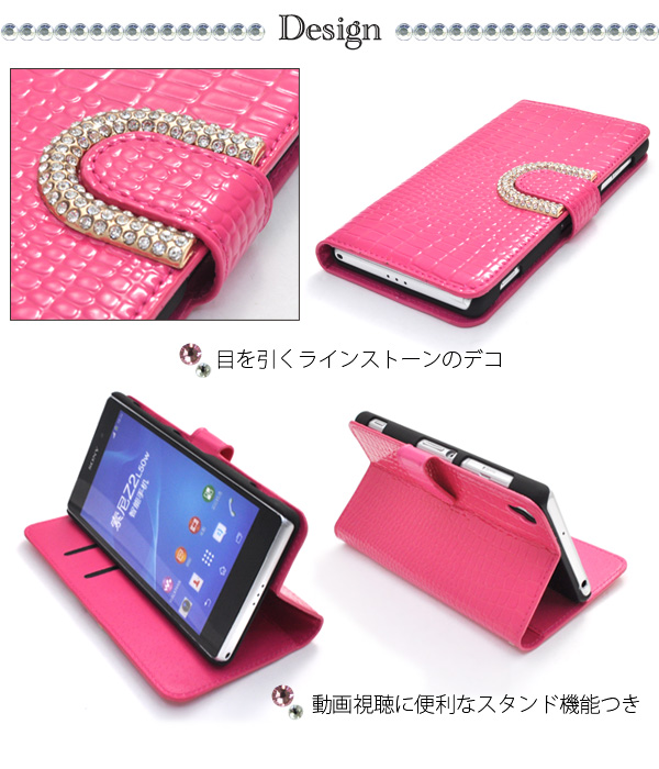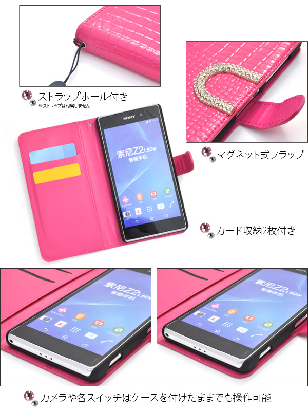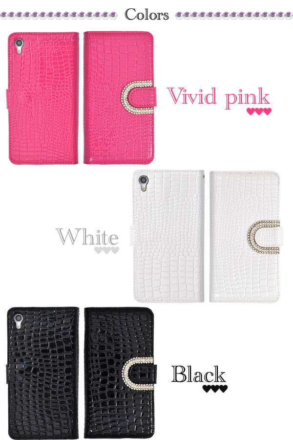 クロコダイルレザーデザインにデコをあしらった女性にピッタリのポーチケースです。 内側にはカード収納がついているので、定期やICカードなどを入れてお使いいただくと便利です♪ 開閉はマグネット式で、使い勝手の良い手帳型です。またストラップホールもついています。 衝撃やキズなどからXperia Z2 SO-03F用を守るのはもちもん、 カメラ、イヤホンや各種ボタンなどをケースに入れたまま操作可能です。 カラーはビビッドピンク、ホワイト、ブラックの3色からお選びいただけます。 ※Xperia Z2 SO-03F用は付属しません。 ※ライセンス商品ではありません。 |