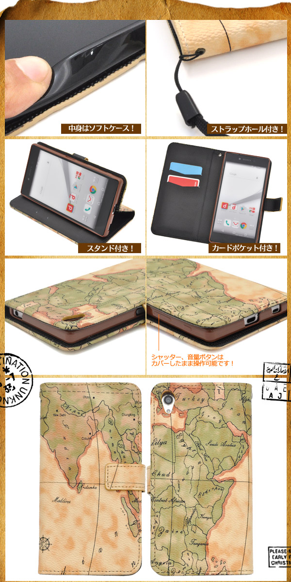 レトロな世界地図デザインがオシャレな、Xperia Z5 Premium SO-03H用ケースポーチ!