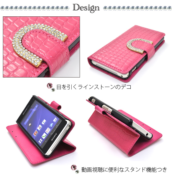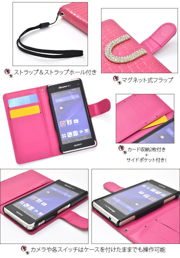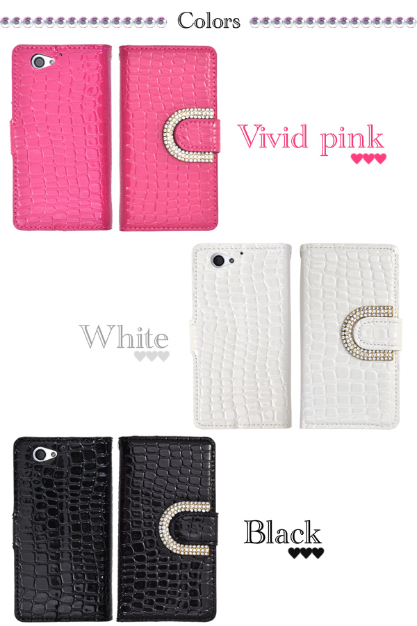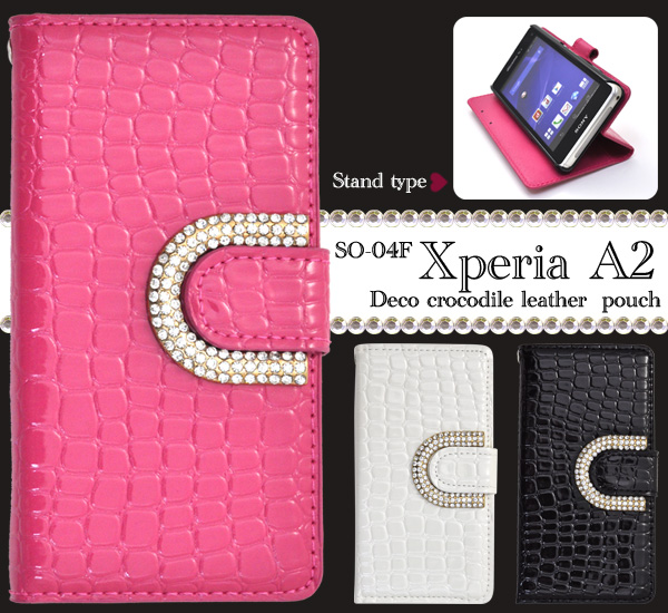 クロコダイルレザーデザインにデコをあしらった女性にピッタリのポーチケースです。 内側にはカード収納とサイドポケットがついているので、 定期やICカードなどを入れてお使いいただくと便利です♪ 開閉はマグネット式で、使い勝手の良い手帳型です。またストラップとストラップホールもついています。 衝撃やキズなどからXperia A2 SO-04Fを守るのはもちもん、 カメラ、イヤホンや各種ボタンなどをケースに入れたまま操作可能です。 カラーはビビッドピンク、ホワイト、ブラックの3色からお選びいただけます。 ※Xperia A2 SO-04Fは付属しません。 ※ライセンス商品ではありません。  |