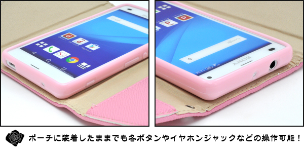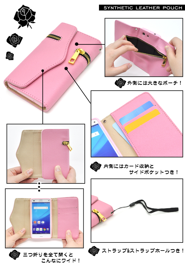 外側のチャックを開けるとポーチ替わりになって便利! アクセサリーなどを入れておけば無くす心配もありません。 内側にはカード収納ポケットが2つとサイドポケットが付いています。 また、ストラップホールとストラップ付きです。 もちろん、ポーチを装着したまま充電やヘッドフォンジャックなどの接続、各種ボタンの操作も可能です。 カラーはピンク、レッド、ブラック、ホワイトの4色からお選びいただけます。 ※Xperia A4 SO-04Gは付属しません。 ※ライセンス商品ではありません。 |