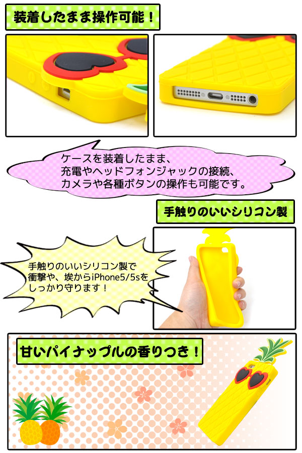 ■パイナップルの香りつき!iPhone5/5s用フルーツケースパイナップルデザイン■ 色鮮やかなパイナップルの形をしたiPhone5/5s用ケースです! シリコン製のソフトカバーで手触りも抜群! 衝撃やキズなどからiPhone5、iPhone5s用を守るのはもちもん、 カメラ、イヤホンや各種ボタンなどをケースに入れたまま操作可能です。 イエロー、ビビッドピンク、グリーンの3色からお選びいただけます。 ※iPhone5/5sは付属しません。 ※ライセンス商品ではありません。 |