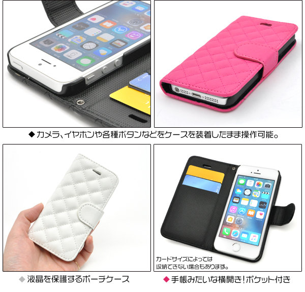 触り心地抜群のキルティングレザーを使用したオシャレなケースポーチです。 内部に備えられたプラスチックケースでしっかり固定し、 衝撃やキズ、埃などからiPhone5/iPhone5s/iPhoneSEをしっかりと守ります。 背面を折り返すとスタンドとして使用できるので、動画視聴に便利です。 ポーチの内側にはポケットが付いているので、カード類を入れるのに便利! ケースを装着したまま、充電やヘッドフォンジャックの接続、カメラや各種ボタンの操作も可能です。 ブラック、ビビットピンク、ホワイトの3色からお選びください。 ※iPhoneは付属しません。ライセンス商品ではありません。 ※ケースをつけたまま撮影できますが、フラッシュ撮影時にケースの色が移り込むことがあります。 |