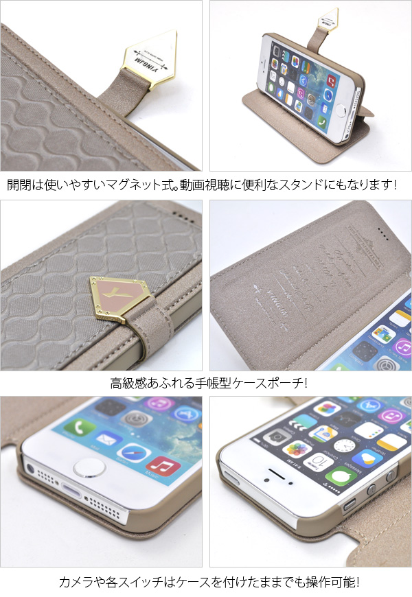 落ち着いた大人の女性っぽいケースです。 衝撃やキズなどからiPhone5、iPhone5s用を守るのはもちろん、 カメラ、イヤホンや各種ボタンなどをケースに入れたまま操作可能です。 横開きタイプなので、手帳のように使うことができます。 また、背面を折り返すとスタンドとして使用できるので、動画視聴に便利です。 カラーはピンク・ブラウン・ブラック・ホワイトの4色からお選びください。 ※iPhone5、iPhone5s用は付属しません。 ※ライセンス商品ではありません。 |