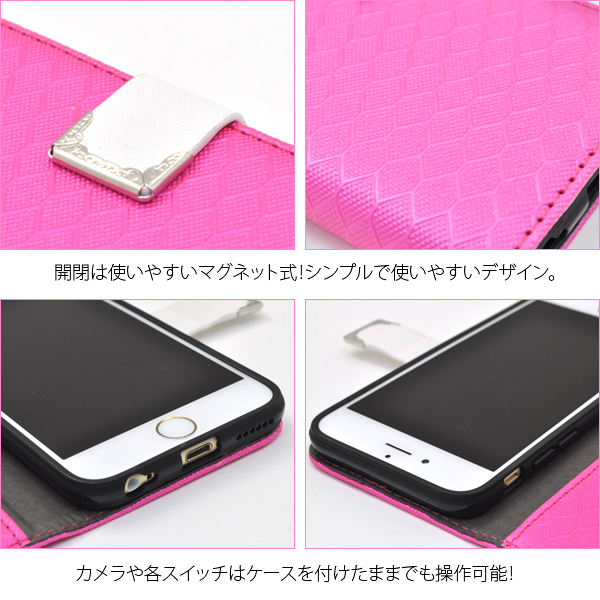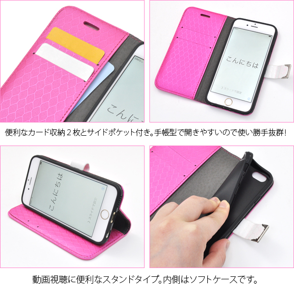 衝撃やキズなどからiPhone6を守ります。 また、内部にはソフトケースを備え、本体をしっかりと固定します。 背面を折り返すとスタンドとして使用できるので、動画視聴に便利です。 横開きタイプなので、手帳のように使うことができます。 また、内側に2つのカードポケットとサイドポケットが付いています。 カラーはブラック、ホワイト、ビビッドピンクの3色からお選びいただけます。 ※iPhone6は付属しません。 ※ライセンス商品ではありません。 |