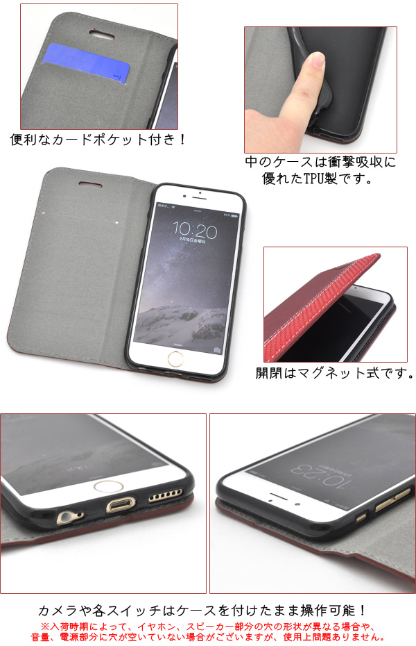 内側はスウェード調になっており手触りも抜群! 便利なカードポケットつきです! 衝撃やキズなどからiPhone6/iPhone6sを守るのはもちもん、 カメラ、イヤホンや各種ボタンなどをケースに入れたまま操作することもできます。 色はレッド、ブルー、シルバー、ピンク、ホワイト、パープル、ブラウン、ブラック、グレーの9色展開です。 ※iPhone6/iPhone6sは付属しません。 ※ライセンス商品ではありません。 ※入荷時期によって、イヤホン、スピーカー部分の穴の形状が異なる場合や、 音量、電源部分に穴が空いていない場合がございますが、使用上問題ありません。 |