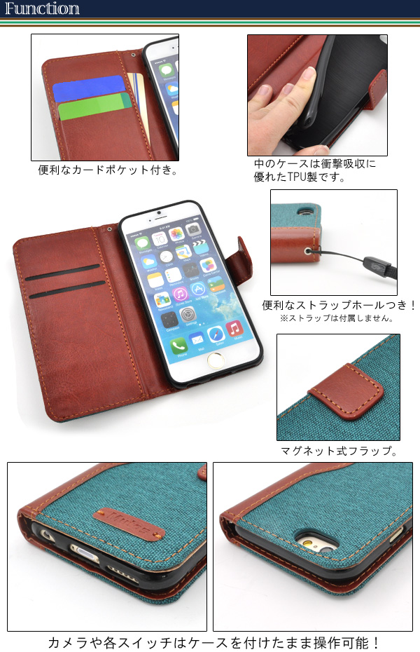 内側にカードポケットとサイドポケット付きでカードの収納に便利です! 開閉はマグネット式で、使い勝手の良い手帳型です。 また、便利なストラップホールも付いています! 衝撃やキズなどからiPhone6/iPhone6sを守るのはもちろん、 カメラ、イヤホンや各種ボタンなどをケースに入れたまま操作可能です。 グリーン、ブルー、ブラック、グレーの4色からお選びいただけます。 ※iPhone6/iPhone6sは付属しません。 ※ライセンス商品ではありません。 |