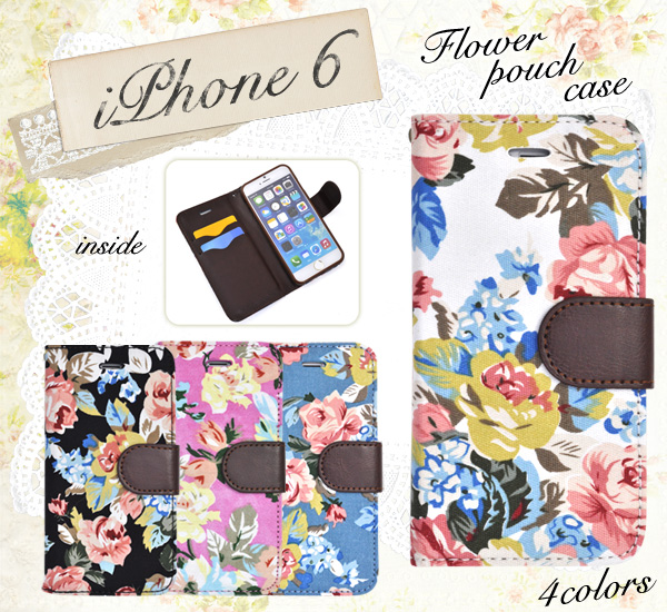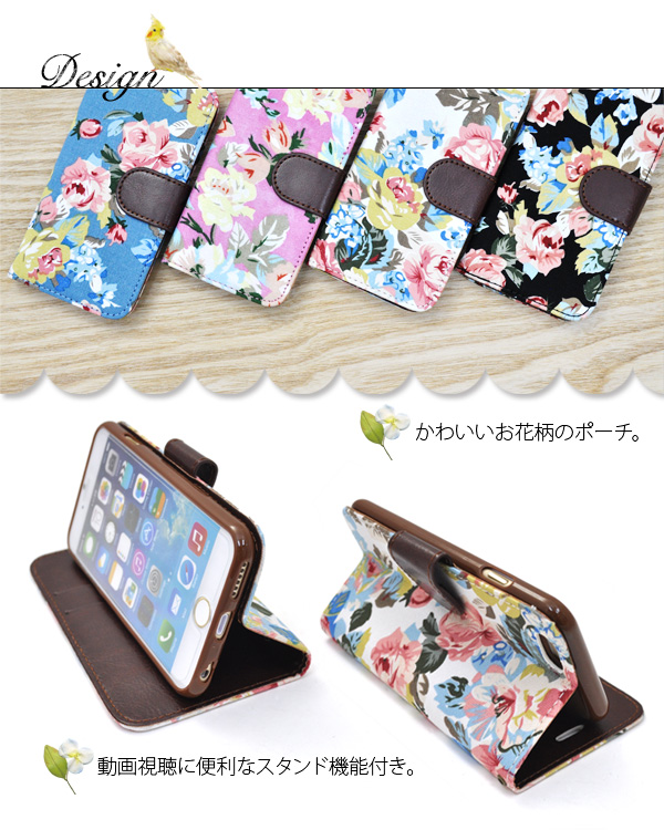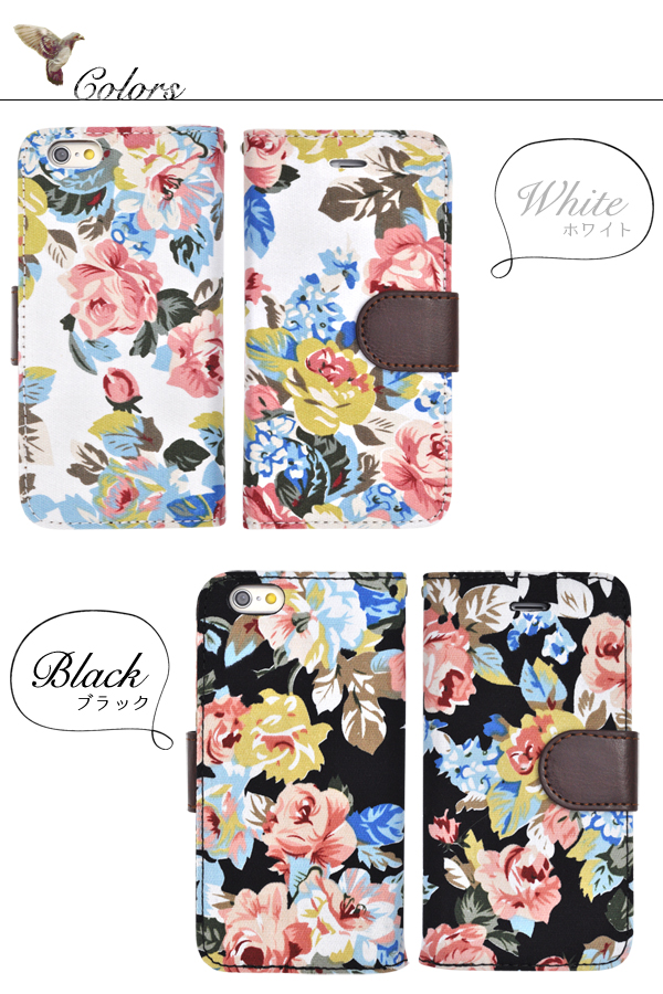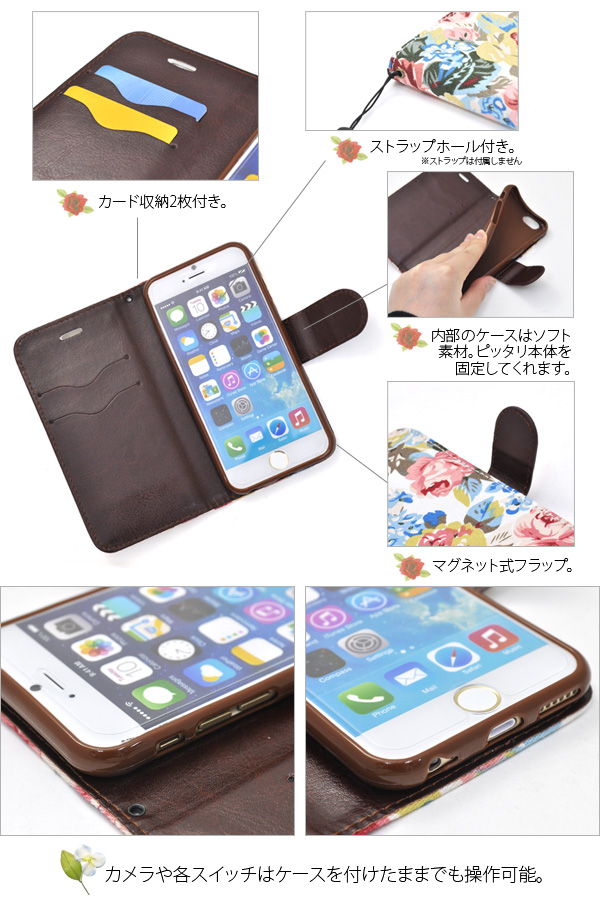 外側は花柄、内側は落ち着いたレザーデザインです。 内側にはカード収納がついているので定期やICカードなどを入れてお使いいただくと便利です♪ 開閉はマグネット式で、使い勝手の良い手帳型です。またストラップホールもついています。 衝撃やキズなどからiPhone6用を守るのはもちもん、 カメラ、イヤホンや各種ボタンなどをケースに入れたまま操作可能です。 カラーはホワイト、ブラック、ピンク、ブルーの4色からお選びいただけます。 ※iPhone6用は付属しません。 ※ライセンス商品ではありません。 |